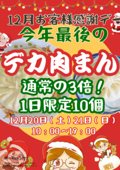 12月も引き続き、お客様感謝デーにてデカ肉まんの販売を予定しています。